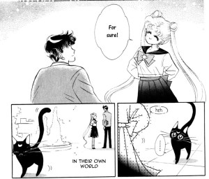 The manga version devotes more time to building up the couple before their past lives are revealed. The initial setup of their meeting and arguing is the same, but soon, they shift to having more positive encounters. Their secret identities don’t stay that way long, with Mamoru catching her transforming and telling her his identity not long after. This is where they move from flirting to mutually pinning for each other. They can’t outright be together because the Senshi and Tuxedo Mask have opposing goals, but Usagi keeps his identity secrets for him, and they continue to have little meetups.